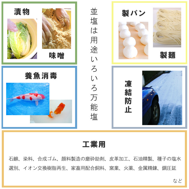 | 詳 細 | 水分:1.317% Ca(カルシウム):0.046% Mg(マグネシウム):0.080% K(カリウム):0.128% NaCl(塩化ナトリウム):97.346% 平均粒径:390μm(マイクロメートル) 製品特性:立方体の結晶性粉末、白色、無着色、無添加 |