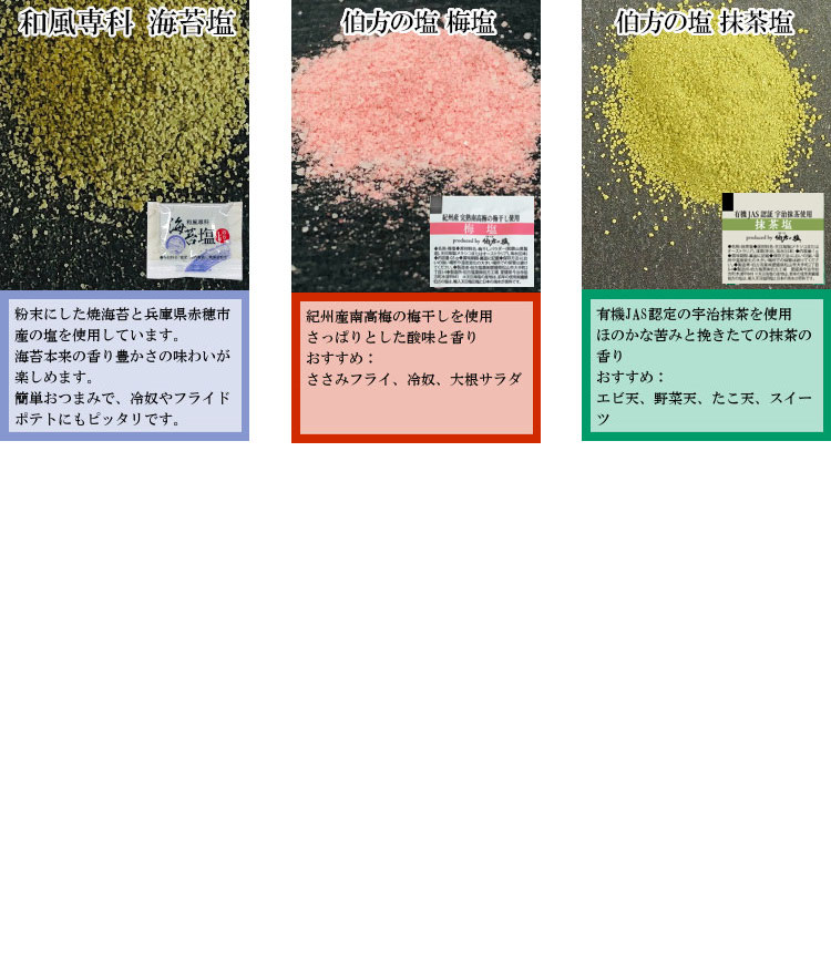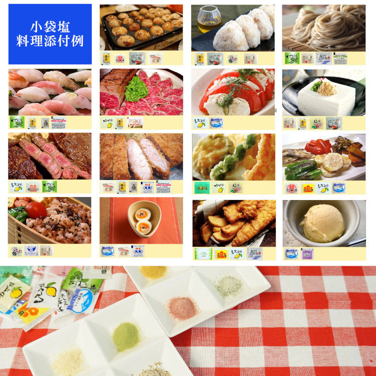 ■商品内容:抹茶塩(1g)、梅塩(1g)、レモン塩(0.5g)、カレー塩(1g)、ハーブソルト(1g)、ゆず塩(1g)、わさび塩(0.5g)、花椒塩(1g)、塩こしょう(1g)、ごましお(1g)、エンリッチ塩(2g)、伯方の塩<焼塩>(1g)、伯方の塩<抹茶塩>(1g)、伯方の塩<梅塩>(0.5g)、伯方の塩<フレーク>(1g)、浜御塩藻塩(1g)、焼藻塩(1g)、ドイツ産岩塩(1g)、アンデス岩塩(1g)、和風専科 海苔塩(1g)、和風専科 だし塩かつお風味(1g)