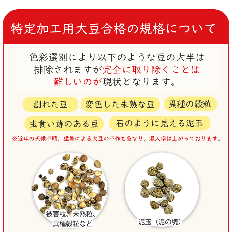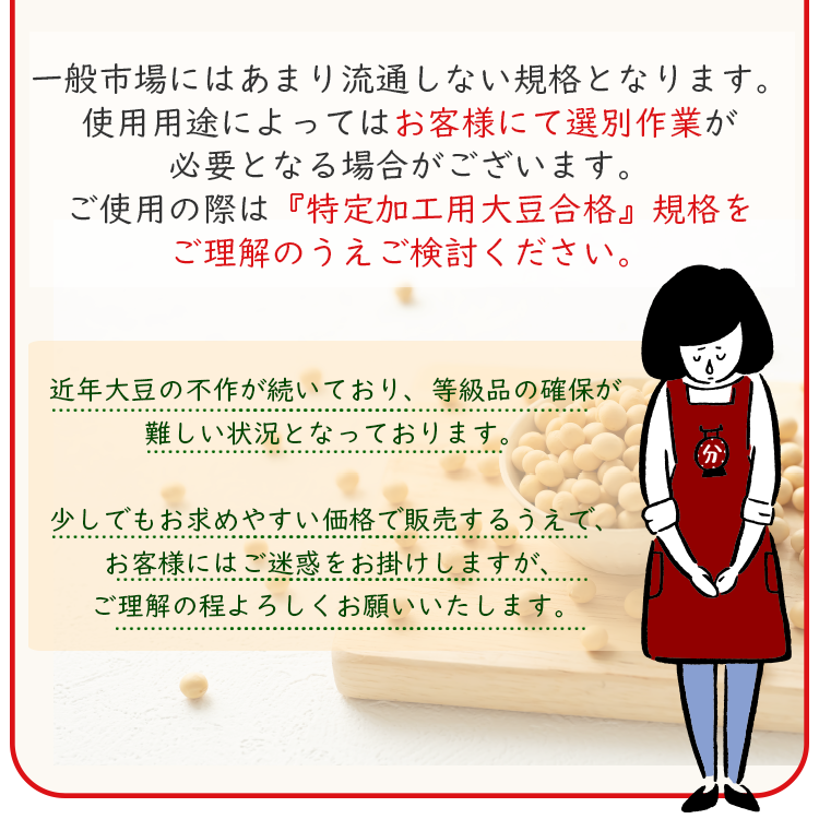 | 詳細 | 産地:福岡県産 品種:ふくよかまる/特定加工用大豆合格 大きさ:小粒 形:球形 へその色:白 |