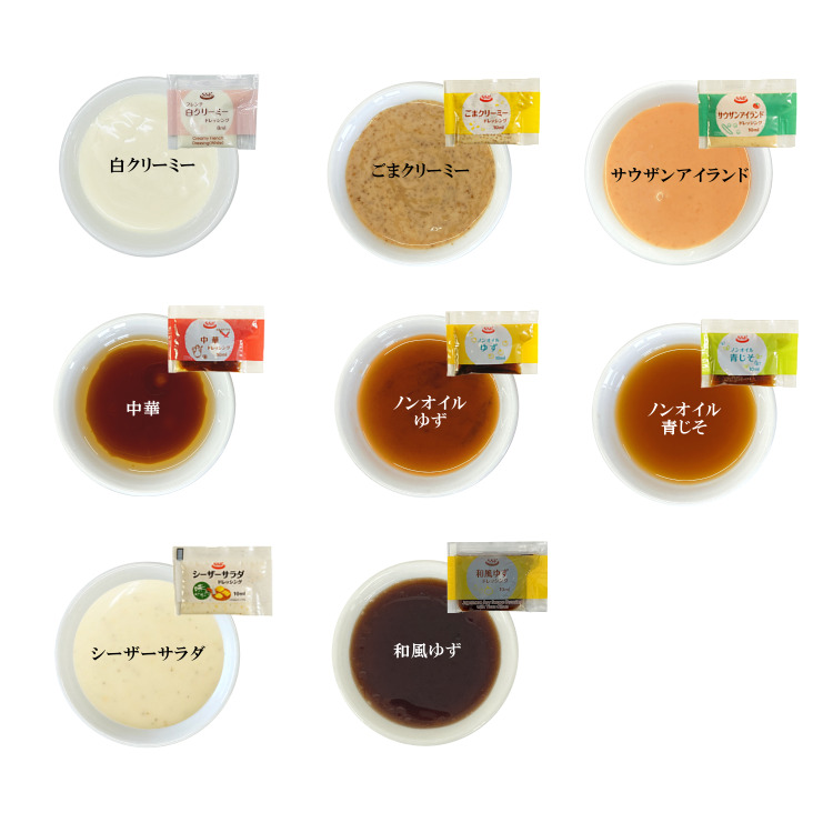 ■商品内容:白クリーミー(8ml)、ごまクリーミー(10ml)、サウザンアイランド(10ml)、シーザーサラダ(10ml)、ノンオイルゆず(10ml)、ノンオイル青じそ(10ml)、中華(10ml)、和風ゆず(10ml)